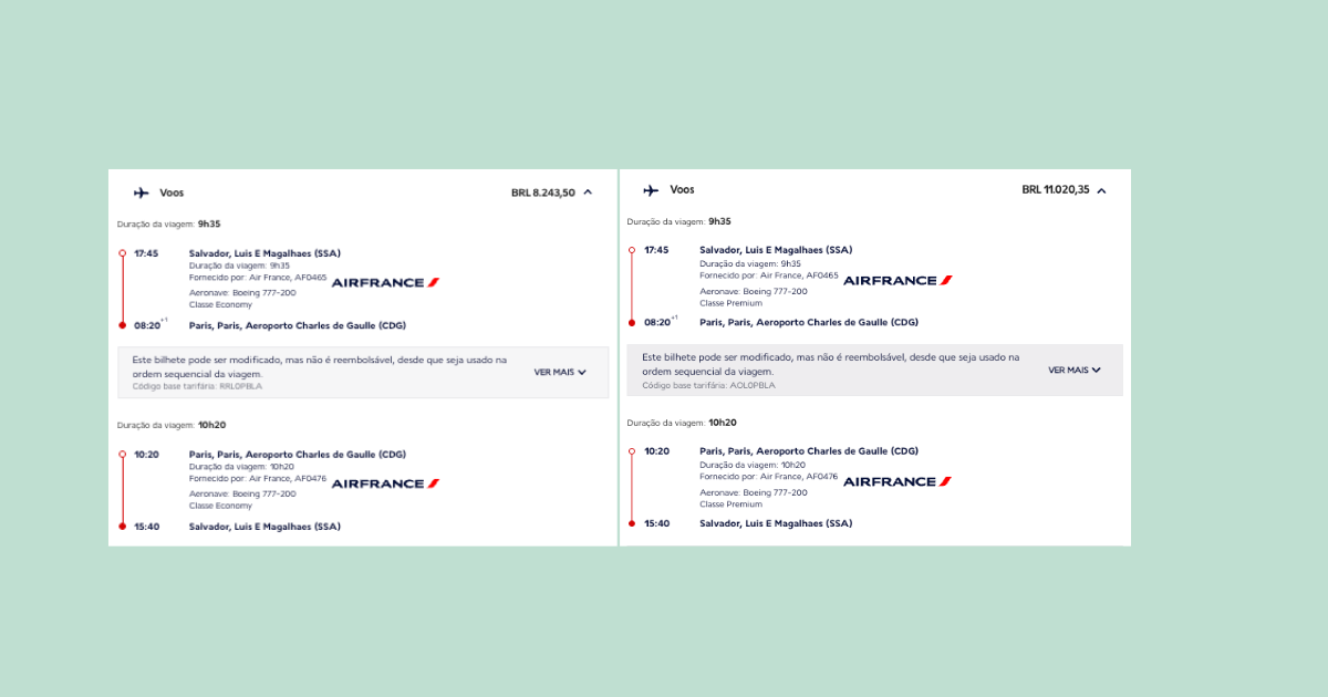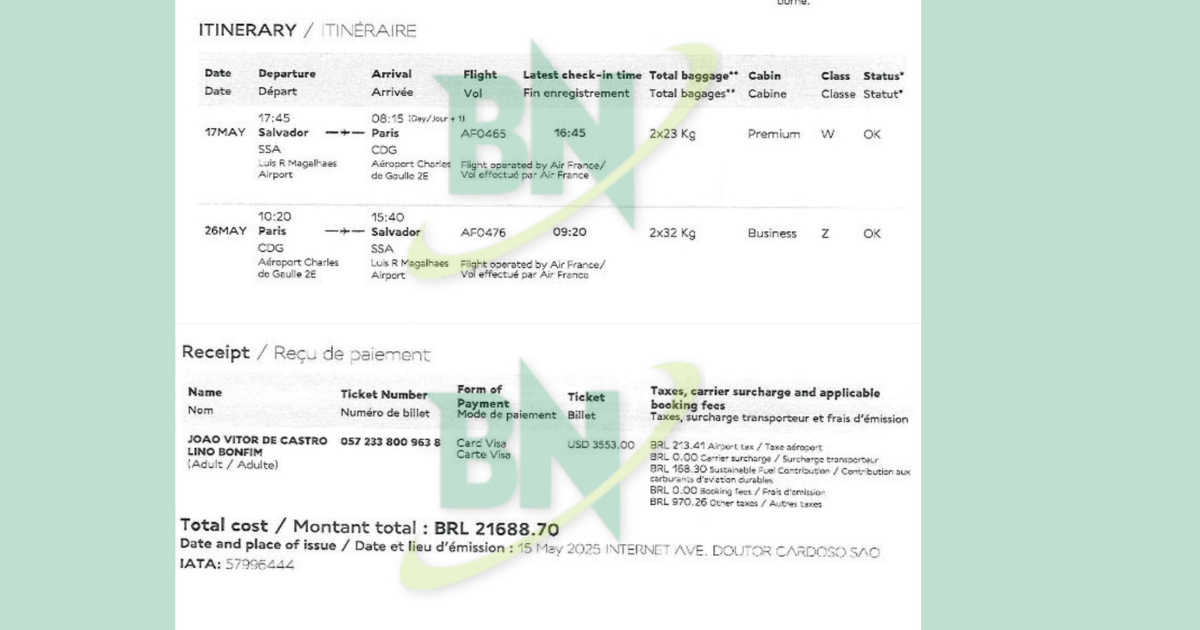 Conforme os dados disponíveis, o parlamentar voou em cabine “Premium” no trecho de ida e retornou em classe Executiva, utilizando voos diretos entre Salvador e Paris, operados pela companhia Air France. A passagem foi emitida em 15 de maio, dois dias antes do embarque. Ainda segundo o documento, o ticket emitido custou U$ 3.553, pago em cartão de crédito Visa.