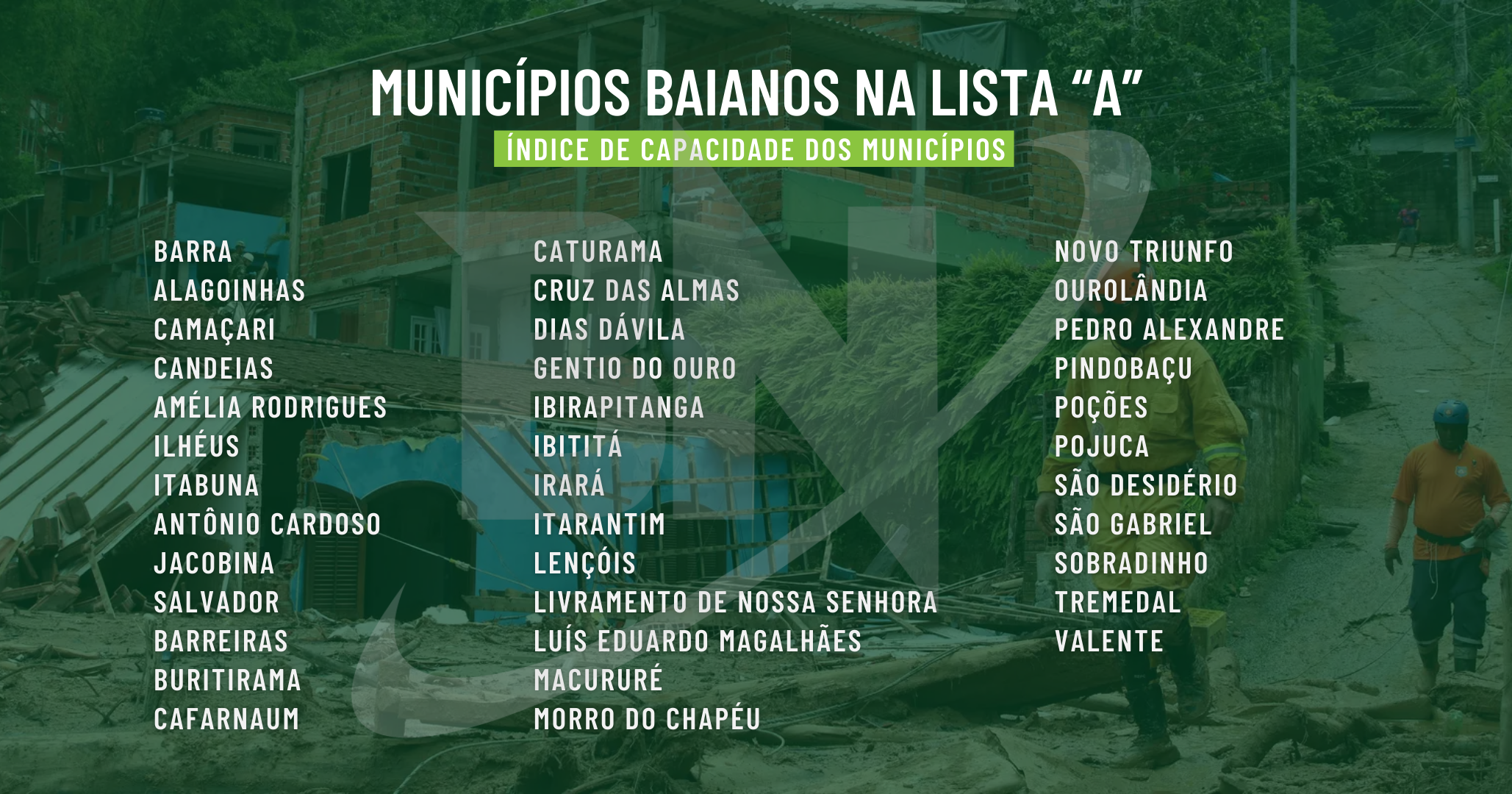 Os resultados obtidos pelas avaliações do Indicador de Capacidade Municipal (ICM) são divididas em quatro resultados, em formatos de listas de A a D, sendo a primeira a de melhor gestão, com maior correspondência entre a estrutura de Defesa Civil do município e as variáveis analisadas pelo MIDR. Confira a lista dos municípios baianos na Lista A: