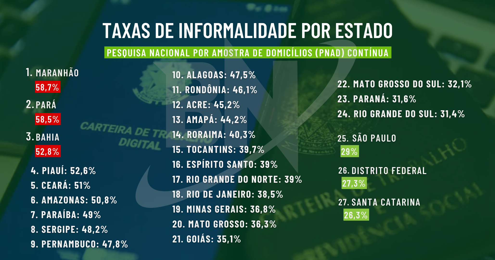 A pesquisa do IBGE permite identificar desigualdades no nível de informalidade do mercado de trabalho ao longo do país. Enquanto o país terminou 2025 com informalidade de 38,1%, 18 estados ficaram acima dessa marca, com destaque negativo para as regiões Norte e Nordeste.