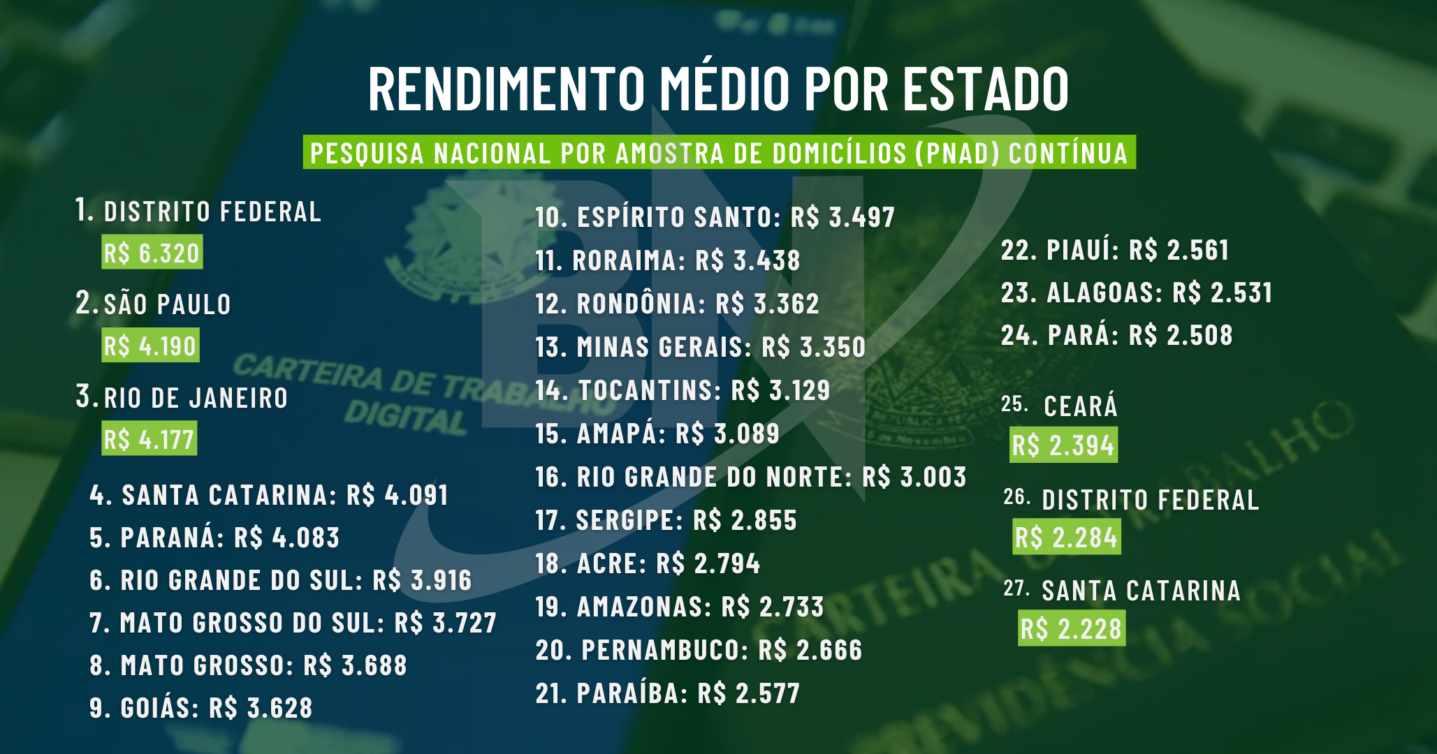 O IBGE aponta ainda que o DF e oito estados fecharam o ano com rendimento mensal do trabalhador acima da média do país (R$ 3.560). O DF lidera com sobra o ranking, explicado pelo grande contingente de funcionários públicos na capital federal, que conseguem uma remuneração acima da média da iniciativa privada.