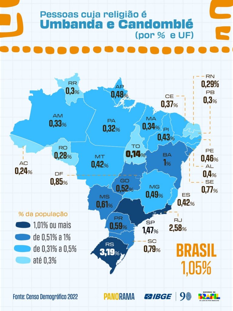 No ranking proporcional por estados, o Rio Grande do Sul lidera com 3,19% da população adepta, seguido por Rio de Janeiro (2,58%) e São Paulo (1,47%). A Bahia aparece na sequência, consolidando-se entre as unidades da federação com maior presença dessas religiões.